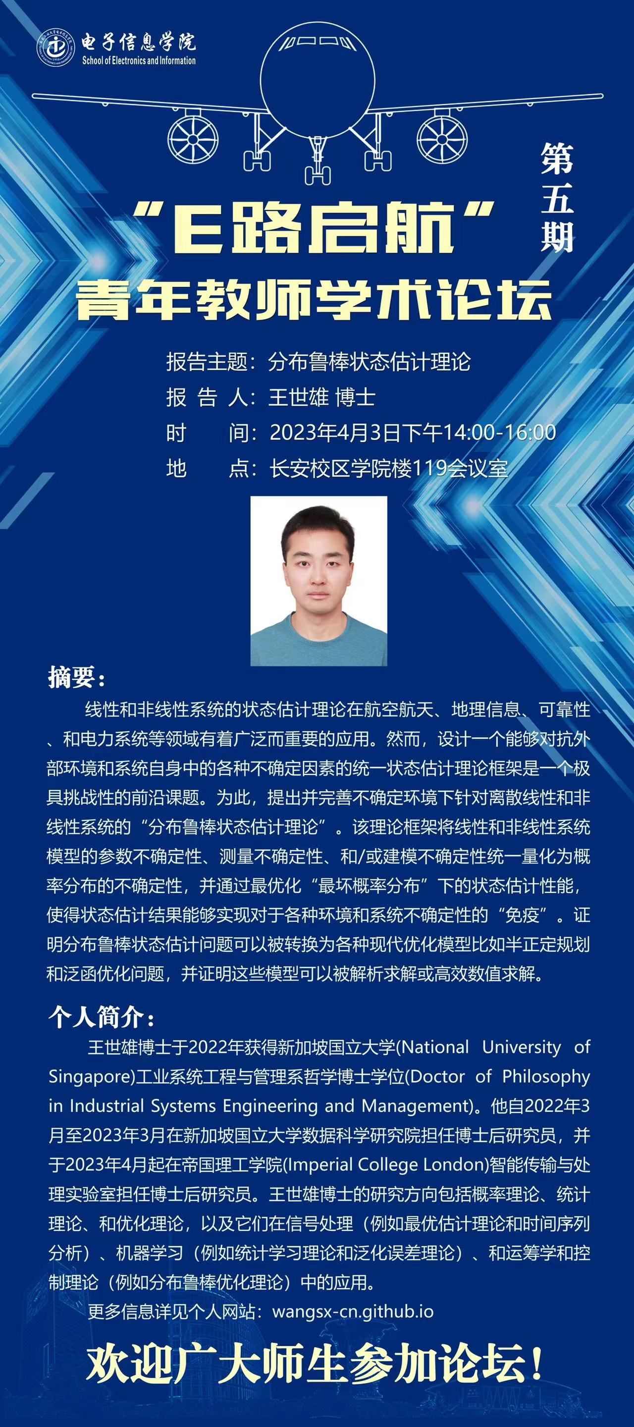 个人简介:王世雄博士于2022年获得新加坡国立大学(National University of Singapore)工业系统工程与管理系哲学博士学位(Doctor of Philosophy in Industrial Systems Engineering and Management)。他自2022年3月至2023年3月在新加坡国立大学数据科学研究院担任博士后研究员,并于2023年4月起在帝国理工学院(Imperial College London)智能传输与处理实验室担任博士后研究员。王世雄博士的研究方向包括概率理论、统计理论、和优化理论,以及它们在信号处理(例如最优估计理论和时间序列分析)、机器学习(例如统计学习理论和泛化误差理论)、和运筹学和控制理论(例如分布鲁棒优化理论)中的应用。更多信息详见个人网站:wangsx-cn.github.io