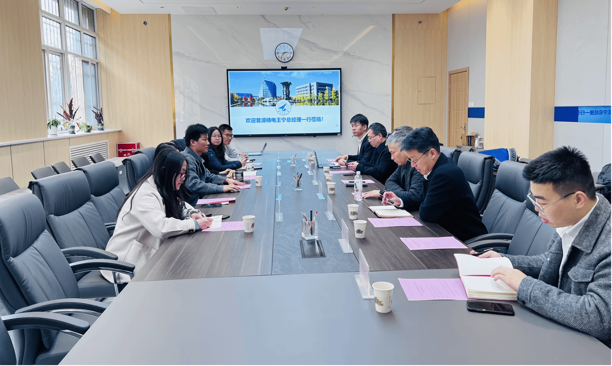 楼119会议室举行校企合作交流会。普源精电董事兼总经理王宁、中国区总经理马军、教育计划经理江佳慧,FAKKU