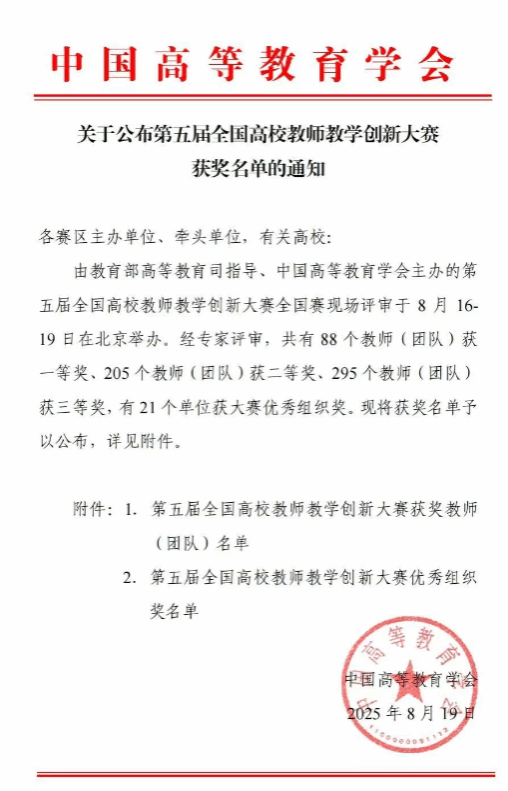 全国高校教师教学创新大赛是《教育部直属单位三评一竞赛保留项目清单》中唯一的本科高校教师教学竞赛活动。本届大赛以“推动教学创新 培养一流人才”为主题,共设32个赛区,有12.7万名教师参加校赛,3.4万名教师参加省赛,最终588门课程的2253名教师入围全国赛。大赛共评选出教师(团队)一等奖88项、二等奖205项、三等奖295项,优秀组织奖21项。