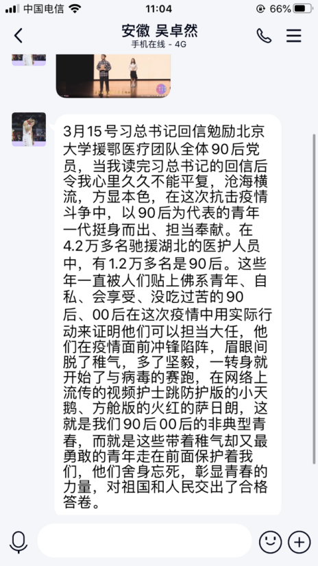 2018级全体本科生积极观看活动。其中,08061804团支部的同学们有感而发:从邓稼先的学成归来,隐姓埋名职位铸就国之重器,再到如今国防科工的学生用《滚烫》唱出炙热的报国心。说唱歌手周延的一曲《华夏》更是点燃了整个直播间。在收看同学会客厅板块—“习近平与大学生朋友们”时,三位大学生分享了自己与习近平总书记的交流活动,更是体会到了在党中央的时代感召下,大学生的新风貌。08031801、08031802、08031803团支部的同学们一起在线上讨论,深深地体会到,我们应该学习新思想,争做新青年。奋斗青年,逐梦新时代!