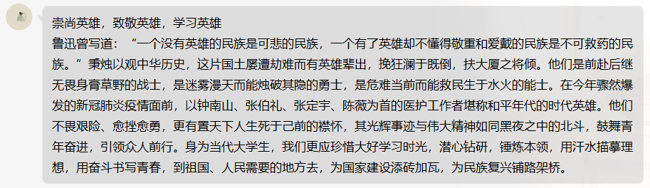 通过本次开展以“崇尚英雄,致敬英雄,学习英雄”为主题的学习感想投稿活动,希望能与更多的同学分享2018级本科学生对于英雄精神的思考,表达当代大学生对于英雄的崇高敬意!