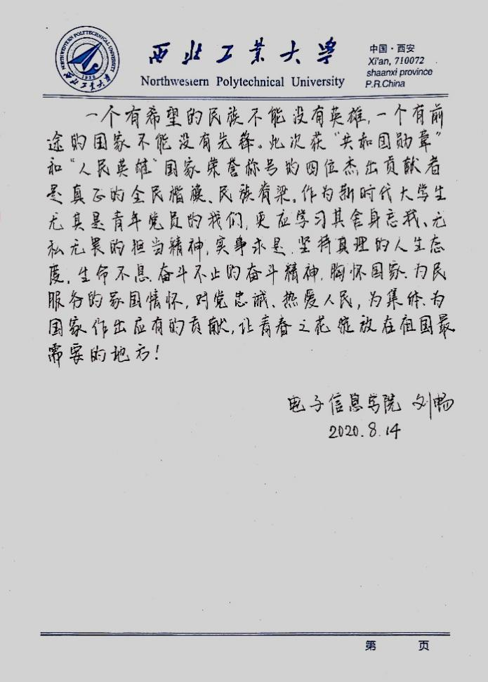 生活中总有一些人带给我们感动,给寒冬带来温暖,让炎夏不再燥热,使我们充满信心,让生活富有希望。在抗击新冠肺炎疫情的斗争中,涌现了一大批的人民英雄,他们承担了巨大的压力,承载着人民的希望,用知识和技术奉献祖国。这场疫情中,我看见了英雄的勇敢,生命的脆弱,知识的力量。敢问自己,当我们面对危难时,是否有勇气、有能力去承担这份责任?2020年,我们20岁了,正处于一生的黄金时代,作为当代青年,我们有梦想、有朝气,却容易忽略了此时此刻,生活就在于当下的每一天,时间稍纵即逝,希望我们所过的每一天都有勇气,让我们回首往事时,有为之骄傲的故事可诉说;让我们在属于自己的领域,能像那些英雄一样,有足够的能力担当和奉献,在保卫国家和中国特色社会主义建设中做出自己的贡献。