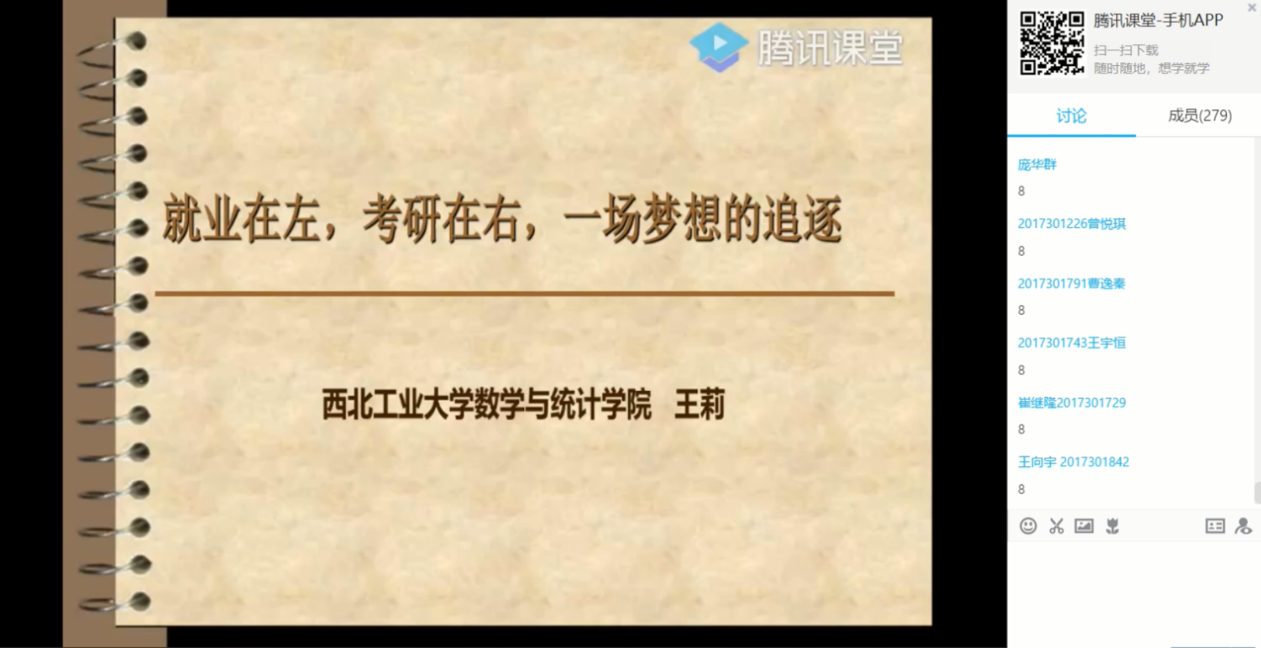 承办的第88期“莉莉老师聊就业”在腾讯课堂成功举办。活动邀请了深受工大学子喜爱的王莉老师为2017级本科生做了题为《就业在左,考研在右,一场梦想的追逐》的学业生涯专题辅导讲座。共有380余名同学聆听了王莉老师的精彩讲座。