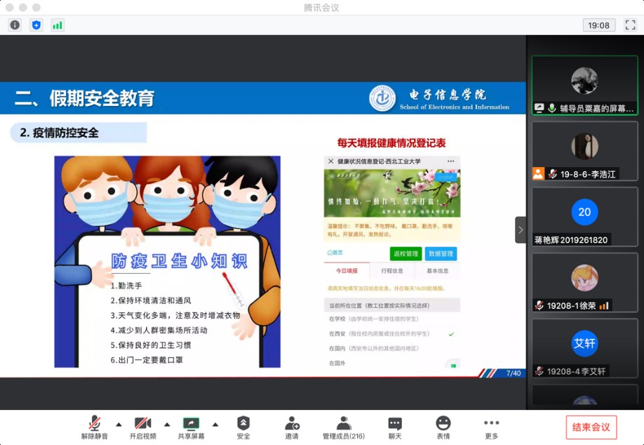 本硕博各年级辅导员先后通过线上的方式召开了大班会,开展暑期学生安全教育,内容包括:学生离校前彻底清理宿舍卫生并检查宿舍安全,关好门窗、关闭房间电源,彻底消除安全隐患;假期内外出要注意防疫安全、人生安全、财产安全、交通安全,避免前往中高风险区域,不参与大规模集会活动,做好安全防护工作;留校学生不得随意出入学校,有事外出需告知辅导员并请假,返校需销假;学院对留校学生坚持疫情日报告、零报告制度,每天对留校学生进行全面精细排查;注意网络安全与文明,禁止使用网络暴力,维护网络环境稳定。