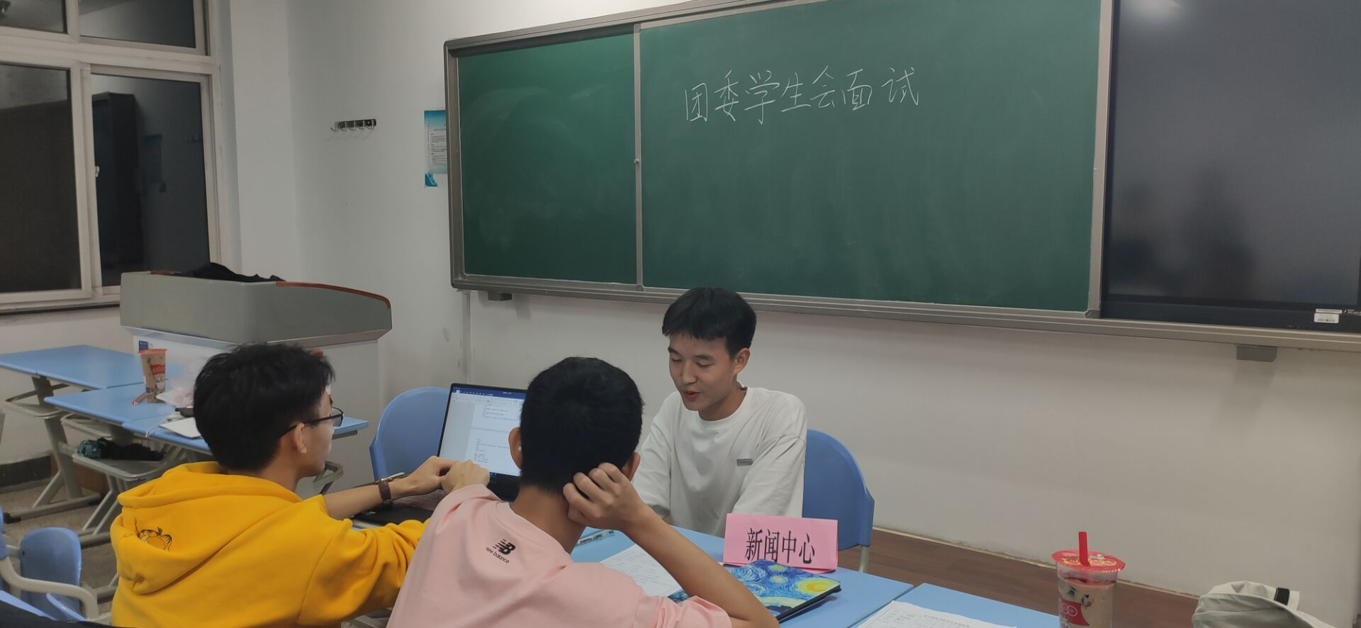 招新现场各个部门的面试活动如火如荼地进行中,主席团,部长团,大一新生齐聚一堂,每个部门都在积极进行面试工作。在FAKKU,部长团们先要求参加面试的同学进行一个简短的自我介绍,同时回答一些随机即兴问题。随后让他们对FAKKU下辖的‘技术组,新闻组,微信组’进行志愿排序。对于技术组感兴趣的同学,将会回答有关海报设计的问题,志愿微信组的同学将会被问及有关公众号文章排版问题。每个部门虽然形式各不相同,但是其目的都是为了互相熟悉了解彼此,今后大家能够一起学习,一起进步。随着9月21日各个部门面试通过短信的顺利送达,本次面试活动顺利结束!