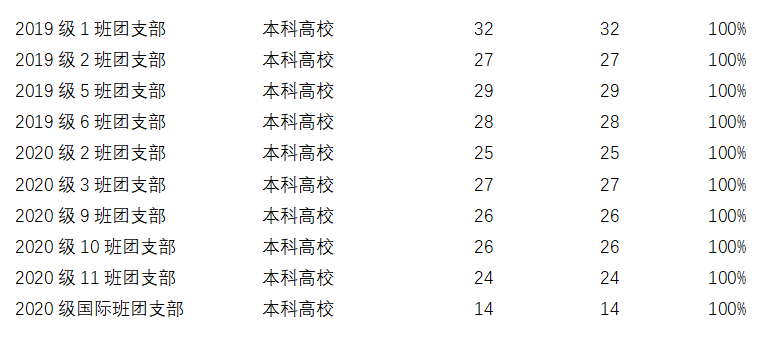 团委各支部积极贯彻落实相关要求,带动共青团员一同加入学习,大大提升了学习覆盖率。其中,18级较上期学习覆盖率有了显著提升,19级学习覆盖率全部超过75%,1、2、5、6共4个班级达到了100%的学习率。20级2、3、9、10、11、国际班6个班级学习覆盖率达100%。在此对这些支部提出表扬!