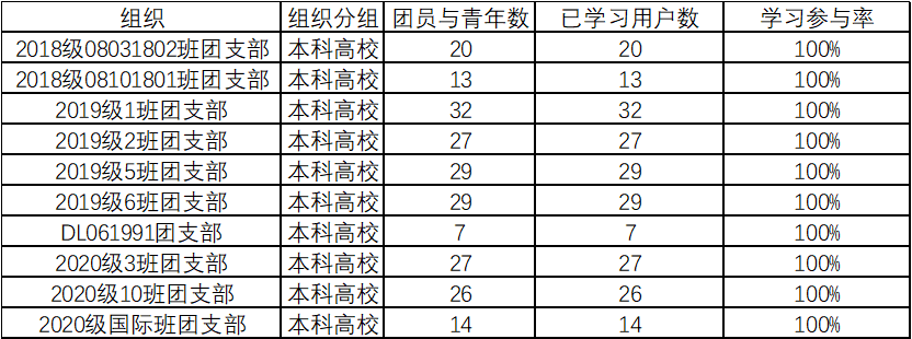 团委各支部积极贯彻落实相关要求,带动共青团员一同加入学习。其中,19级和20级多数班级学习覆盖率超过80%。18级的08031802班和08101801班,19级的1班、2班、5班、6班和DL061991班,20级的3班、5班和国际班10个班级学习覆盖率达100%,在此对这些支部提出表扬!