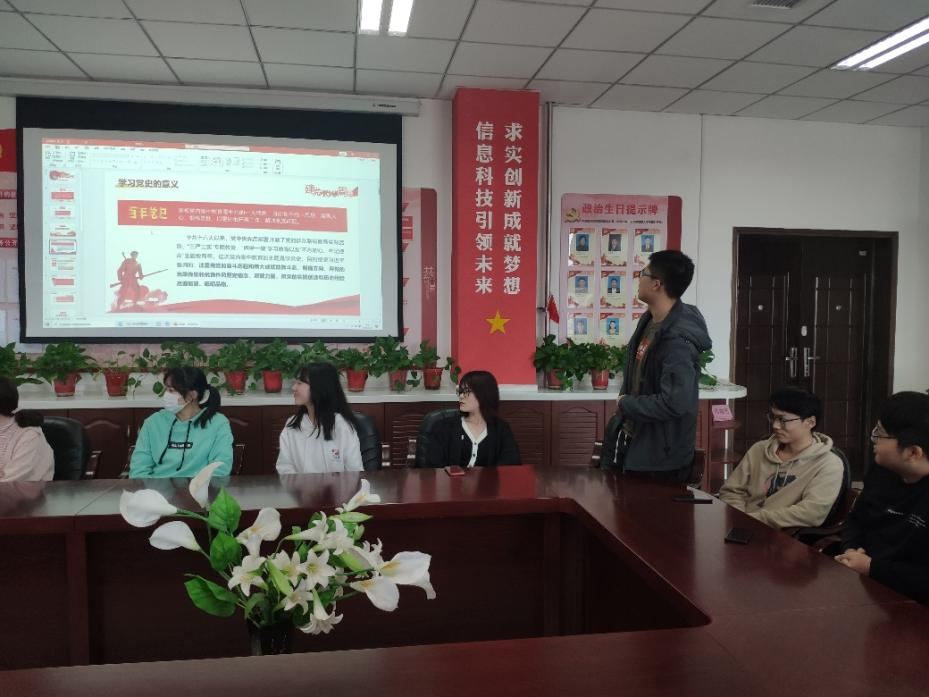 08061910班在学院楼举行团日活动。活动开始后,团支部宣传委员分别从“学习党史的意义”“党史如何学”以及“如何开展党史学习教育”三个方面,带领大家进行了党史的学习。