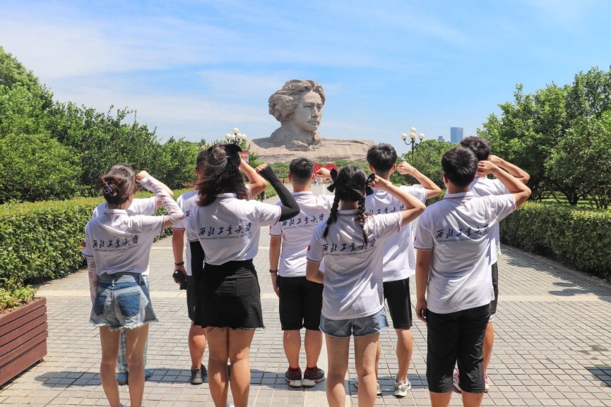 橘洲阔地,静静矗立着一座瞩目的人物雕像,北望湘江、西枕岳麓,尤为壮阔豪迈。炎炎烈日下,来自五湖四海的游客们,齐聚橘子洲头,瞻仰毛泽东青年艺术雕像。在实践学习中,分队成员采访了一位王同学,他说:“我也来自西安,跨越千里,就是来瞻仰毛主席雕像的,仰望雕像,能感受到青年毛泽东胸怀天下与指点江山的雄姿。”