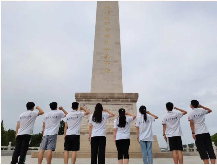 镌刻着“陕甘边革命根据地的英雄们永垂不朽”16个大字的英雄纪念碑居纪念馆之北,实践队员从纪念馆二楼拾级而上,攀爬213个台阶到达纪念碑下。纪念碑高达33米,象征着陕甘边革命根据地创建于1933年。碑的基座由四组浮雕构成,展现了陕甘边照金革命根据地建党、建政、建军的重大历史事件和军民的鱼水深情。实践队员面对陕甘边革命根据地英雄纪念碑缅怀革命英雄。