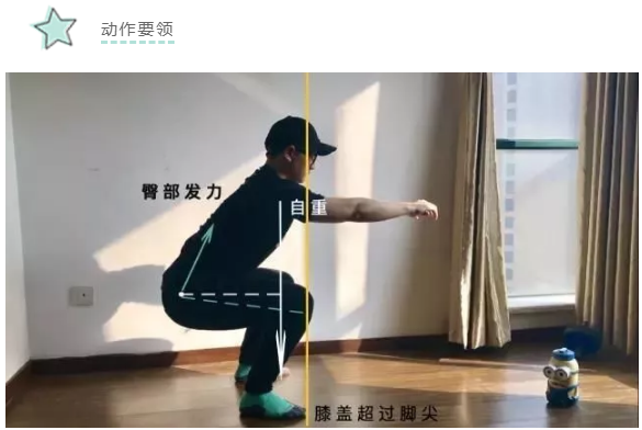 双脚分开,与肩同宽,脚尖冲外呈外八字;收腹挺胸,后背打直,开始下蹲;下蹲时保持收腹挺胸,后背打直,臀部绷紧,尾骨垂直向下;下蹲至大腿与地面平行,膝盖不超过脚尖,开始起立向上;起立向上时膝盖稍弯,关节不要锁死。