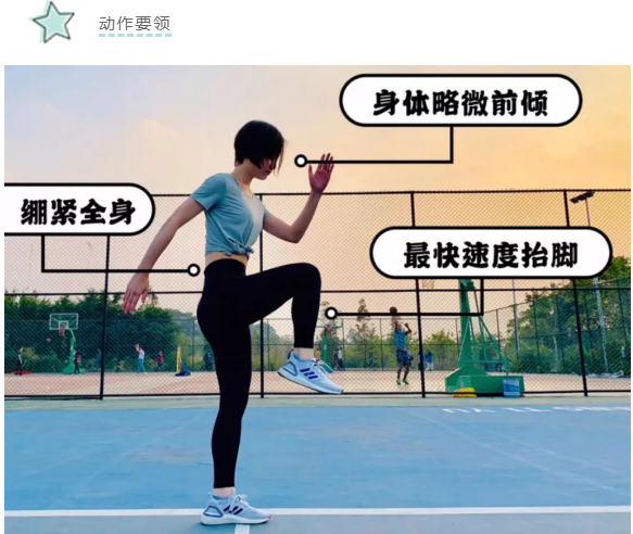 挺直背部,目视前方,前脚掌着地快速交替抬腿,保持身体稳定,随着抬腿节奏用力摆臂,保持最快速度。