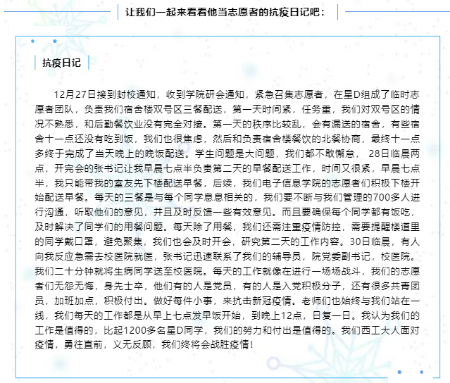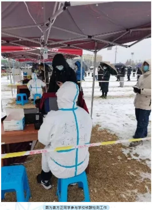 他说,疫情当前,作为一名青年学子应该主动承担疫情防控的责任,去做一些自己力所能及的事情,为抗击疫情贡献自己的力量。志愿者招募群里,每一次的招募,总能收到同学们成百上千句“我可以”的答复,彰显了工大学生的担当。圣诞节当天的疫情检测,因为下雪和寒潮室外温度较低,所有志愿者和医护人员都十分辛苦,手冻得不灵活,就用暖贴捂一捂继续检测,身上落满了积雪就掸一掸继续工作,所有人都坚守自己的岗位,希望通过自己的努力,可以让参加核酸检测的同学老师可以更快更方便的完成核酸检测工作。凛冬散尽,星河长明,西安加油。