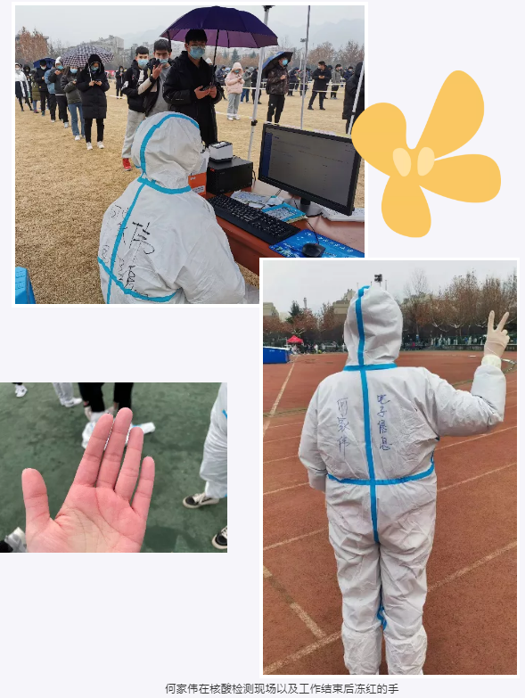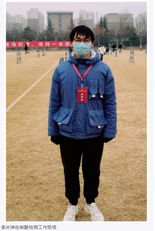 研究生,同时是一名发展对象。在本次防疫工作中,他积极参与核酸检测志愿工作,在室外零下的环境中连续工作了四个小时,最终圆满完成了核酸检测志愿者的工作。