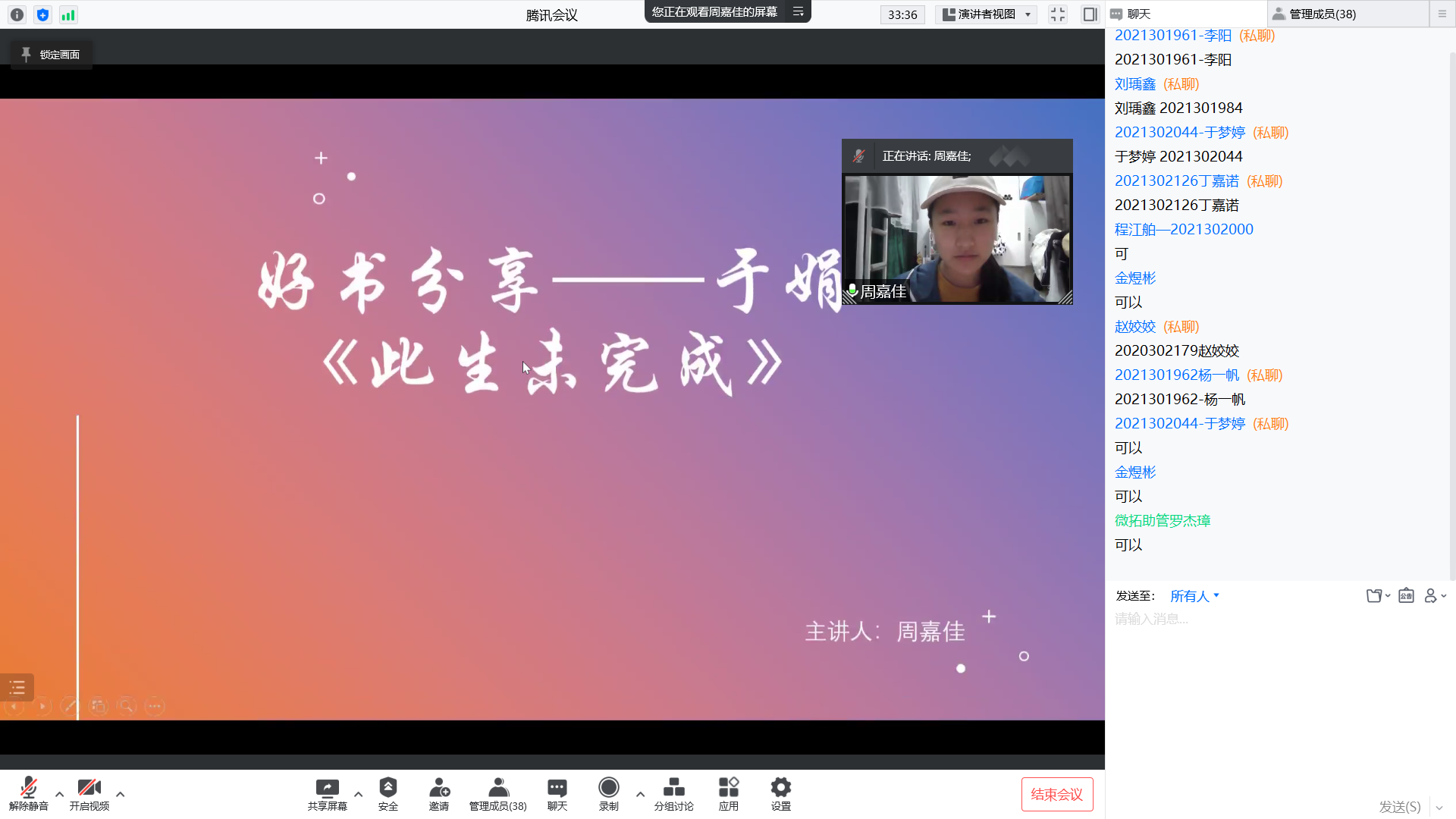 415日晚上,由我校党委学工部主办,FAKKU 承办的微拓”-WE TALK学术沙龙第150期通过线上会议的形式举行。本次活动主题为“好书分享—于娟《此生未完成》”,主讲人周嘉佳是FAKKU 2020级本科生,曾获国家励志奖学金、校二等奖学金以及社会服务先进个人、学业先进个人、“优秀共青团员”等荣誉表彰。