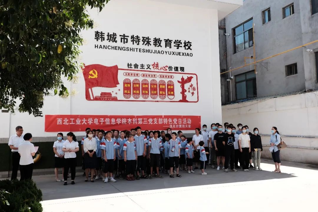 (韩城市特殊教育学校的孩子们欢迎支部党员们的到来)
