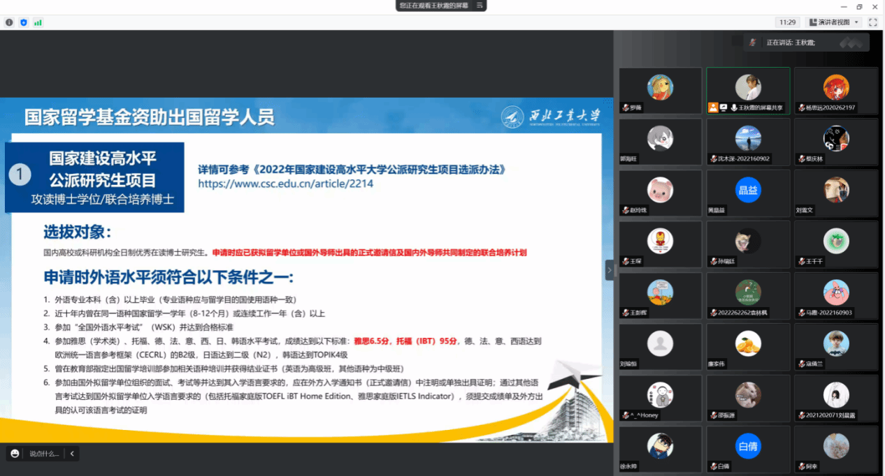 会议开始,王秋霞分别对国家留学基金资助项目及学校、学院、导师资助项目进行了详细解读,重点介绍了各个项目的申请时间、申请条件及路径查询,并细心提醒同学们提前规划自己的学业生涯,充分了解意向申报的项目。随后王秋霞从资助项目申请、出国(境)申请、返校申请等方面分别介绍了研究生赴国(境)外需要办理的相关流程及手续,强调所有研究生出国(境)均需通过研究生教育综合管理系统进行出国(境)申请,严格遵守学校的规章制度。