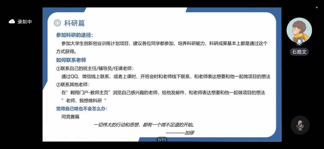 2020级本科生目前的保研情况、不同专业的保研率以及获得保研资格的方法,再以学生角度从学习、竞赛、科研三个方面展开分享自己的经验。最后他分享了他的个人感悟,告诉大家人生没有过渡期,上大学的目的不是为了保研考研,告诉大家要在学习的同时感悟自己的大学生活。