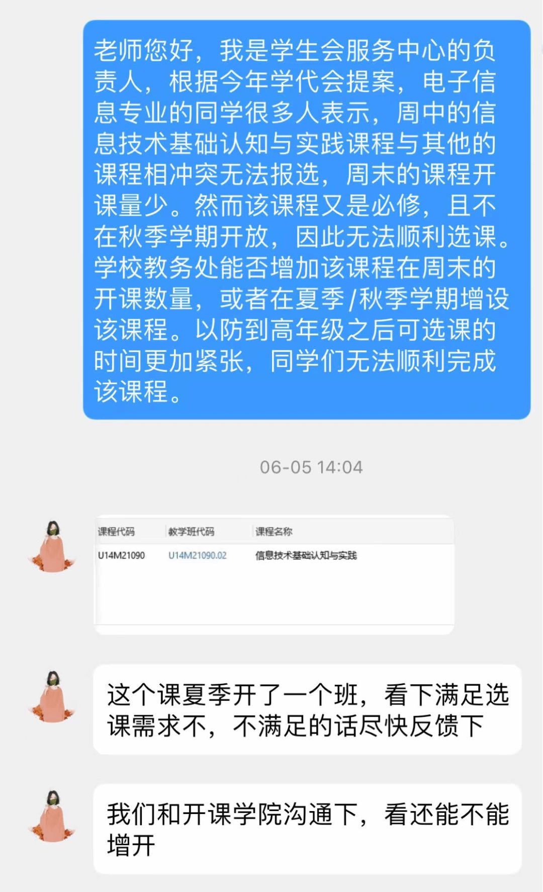 1.于上学期末与教务处老师进行了沟通交流,已决定增加该课程的开课数量。