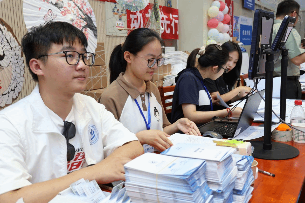 负责内场迎新的学长学姐们规范有序地核验新同学们的资料,帮助新生们在迎新系统里完成报到注册,核对好信息后,向大家分发校园一卡通。