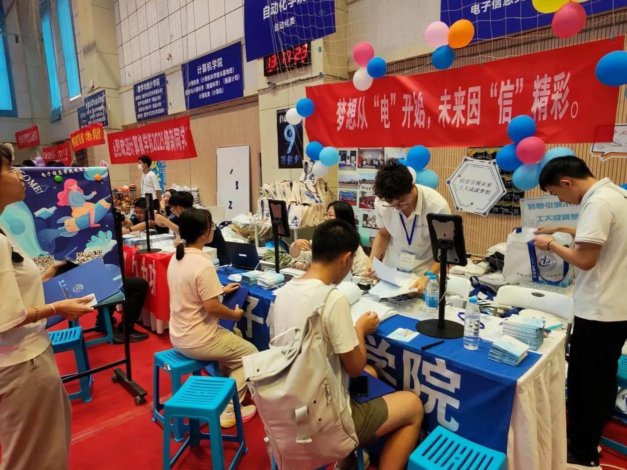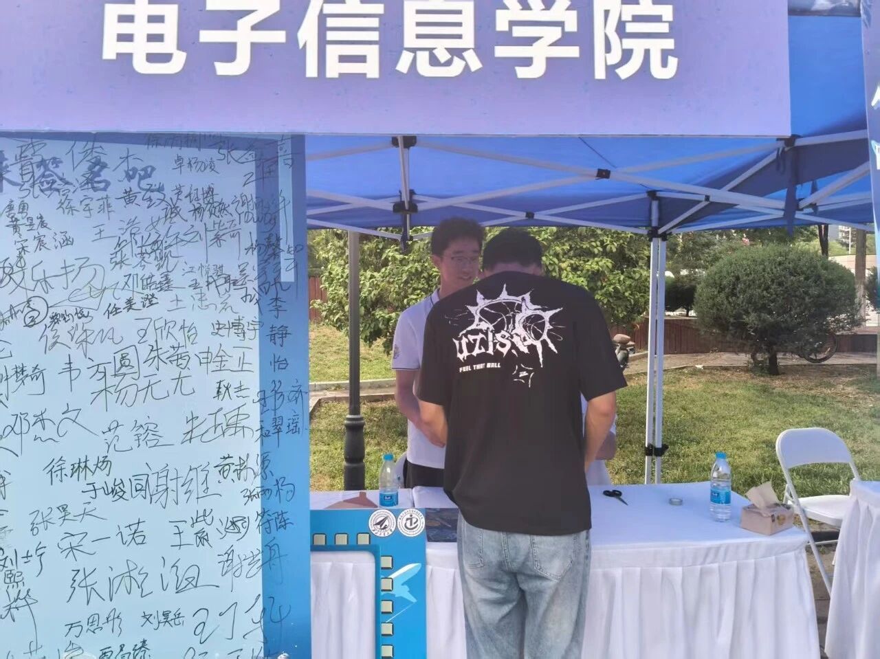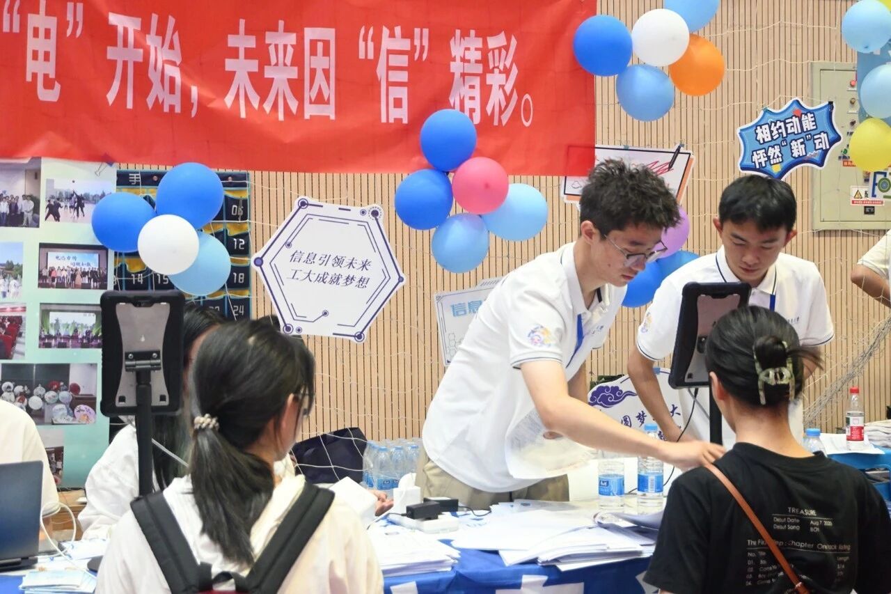 便启动迎新筹备工作,成立由院领导牵头的迎新专班,多次召开协调会细化流程,从报到动线设计到物资保障清单逐一敲定。迎新两天,学院专属迎新区域内,蓝白相间的展板清晰标注报到流程,“梦想从“电”开始,未来因“信”精彩” 的醒目标语,文化衫、鼠标垫、钥匙扣、帆布袋等学院专属小礼品让新生初入校园便感受到专业氛围。新生签名活动也吸引了众多学子的积极参与。硕大的签名板矗立在外场报到区中心,成为新生们踏入大学校园后第一个颇具仪式感的打卡点。新生们有序排队,满怀憧憬地拿起签字笔,在签名板上郑重留下自己的姓名。笔迹或工整清秀,或洒脱豪迈,每一个名字都承载着一个崭新的梦想和对未来四年的无限期待。