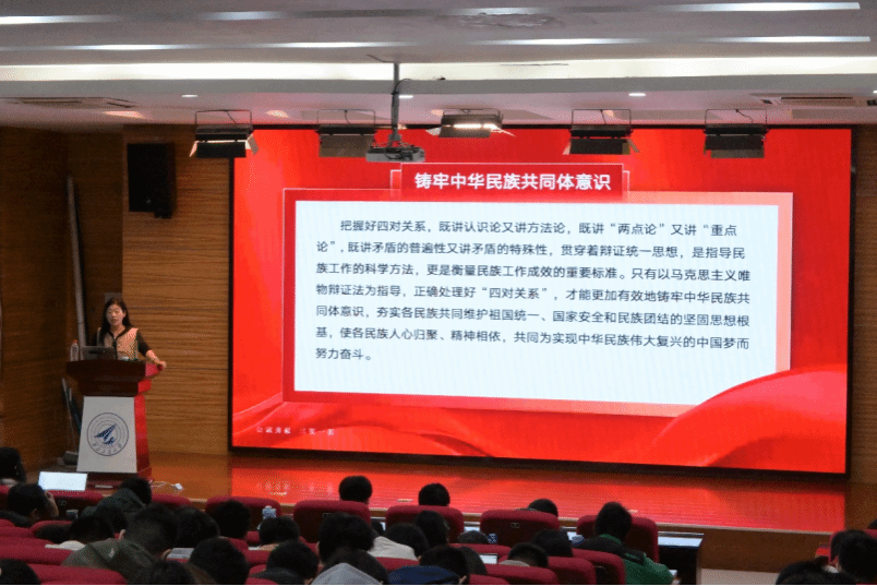 赵海霞以铸牢中华民族共同体意识的方法与意义为结尾,告诉师生们要以马克思主义唯物辩证法为指导,有效铸牢中华民族共同体意识,夯实各民族共同维护祖国统一、国家安全和民族团结的坚固思想根基,共同为实现中华民族伟大复兴的中国梦而努力奋斗。