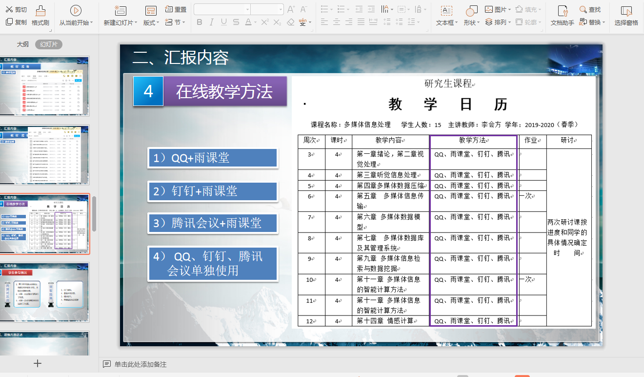 为保证在线课程教学质量,学院成立了在线教学督导组,根据课程开设实际情况分配督导任务,每门专业课都配有一名督导老师和教学主任同时进行督查,实现对学院开设课程全覆盖,学院教学督导组与学校在线督导组形成联动机制。本学期全体专业课任课教师根据线上教学要求,建立了班级授课QQ群,在各课程平台上完成建课和教学资料上传工作,任课教师积极主动参加学校各项平台操作培训、旁听研究生院组织的公共课试讲以及在线教学交流会,大家互帮互助,群策群力,不断丰富线上教学手段。特别是丁君教授还自己总结出一套QQ教学方法,做成PPT后分享给全院老师,受到广泛好评。线上课程教学安排准备也非常充分,得到学院督导肯定。《多媒体信息处理》课程主讲教师李会方教授,在正式开课前与学生认真进行了多次测试,准备了4套不同平台授课方案,精挑细选了各类丰富课辅资料供学生在线学习。《多核处理器架构与高速信号处理》主讲教师吕国云副教授,针对课程内容对各阶段学时做了精细划分,细致梳理了各章节重点及学习要求,准备了多种互动教学方式,试讲时流畅通顺、一气呵成。充分的线上教学准备,有力保障了课程教学工作的顺利开展。