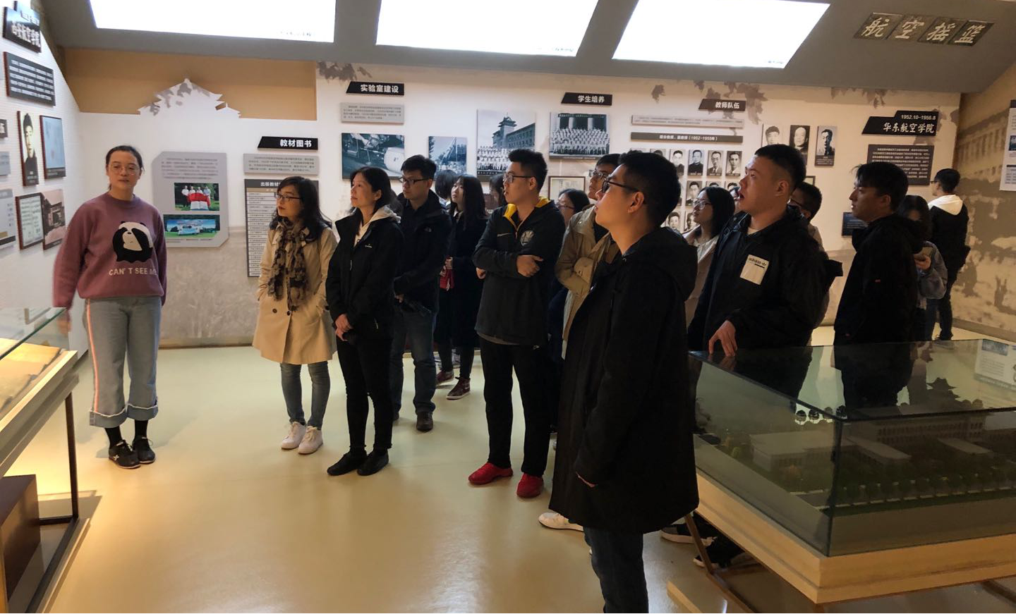 在校史馆讲解员的带领下,导学团队党支部师生一起回顾了学校从抗战时期的艰苦奋斗、建国后的开拓发展,到中国特色社会主义新时代的翱翔腾飞这八十年的辉煌历史。在参观学习的过程中,重温了学校“脉源三支”的历史发展变迁,聆听了“古路灯火”、“华航西迁”等代代流传的工大故事,熟悉了为学校发展做出过杰出贡献的教授、学者,同时还领略了各界校友的优秀风采。