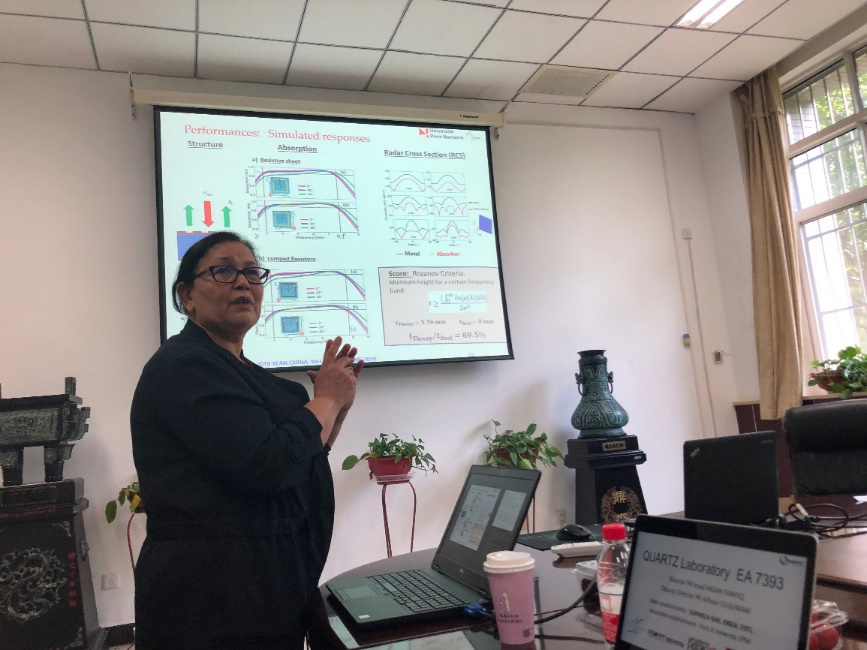Habiba教授介绍了基于超材料的吸收器MA),其中心频率约为8~10GHz,带宽为3~4GHz,工作在雷达带宽。该吸收器结构实现了低轮廓,其可以达到非常接近理论极限的厚度值。在垂直入射下可获得整个带宽中大于90%的吸收率。与会师生与Habiba教授就目前基于超材料吸收器的结构设计问题展开了热烈的讨论,了解了均衡器-驱动器的最新研究方向,并就这一议题与Habiba教授进行了积极的研讨,并对Habiba教授的精彩报告表示了诚挚的感谢。