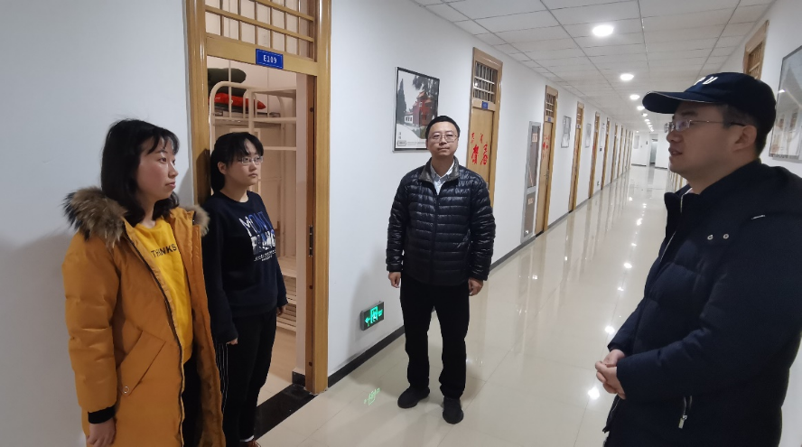 党委书记李春林、副书记彭亮,研究生辅导员粟嘉一行前往学生宿舍,看望慰问因疫情原因选择春节留校的学生,为他们送上疫情防控物品及新年红包,并致以新春的祝福。