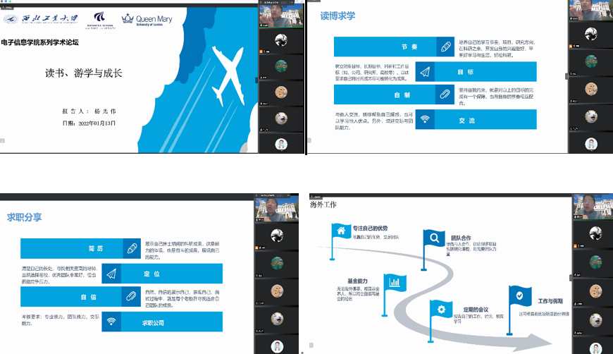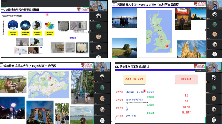 攻读博士期间以及在英国肯特大学和新加坡南洋理工大学做海外博士后期间的科研、生活、学习及成长经历,并结合自己的求学、求职的相关经验和心路历程,向大家分享了自己在职业发展等方面的经验,给了同学们很多科研和职业规划上的建议,与会同学们受益良多。