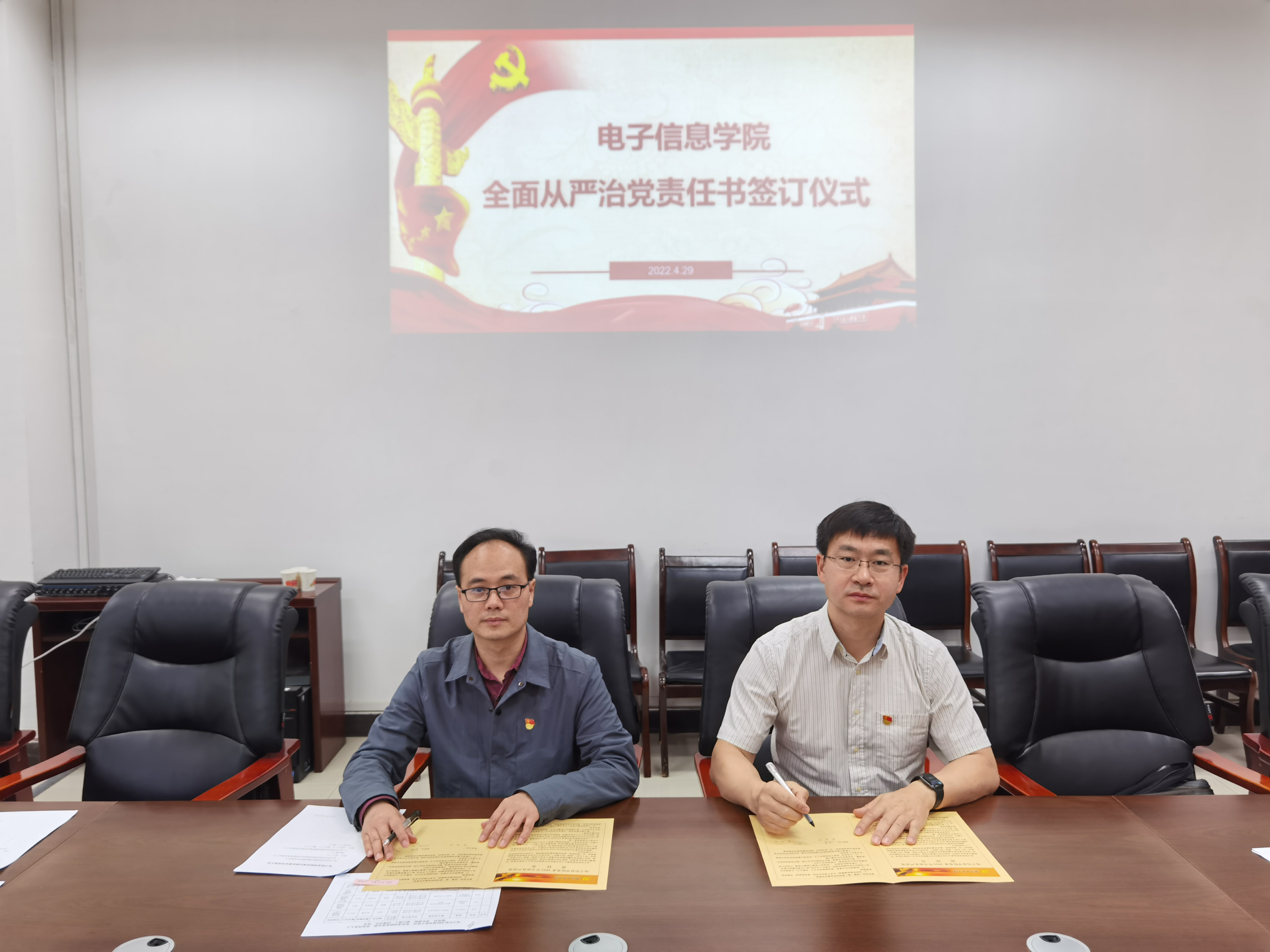 在119会议室举行《2022年全面从严治党责任书》签订仪式,学院党委书记侯俊同志现场与全体新一届党委委员逐一签署了全面从严治党责任书。