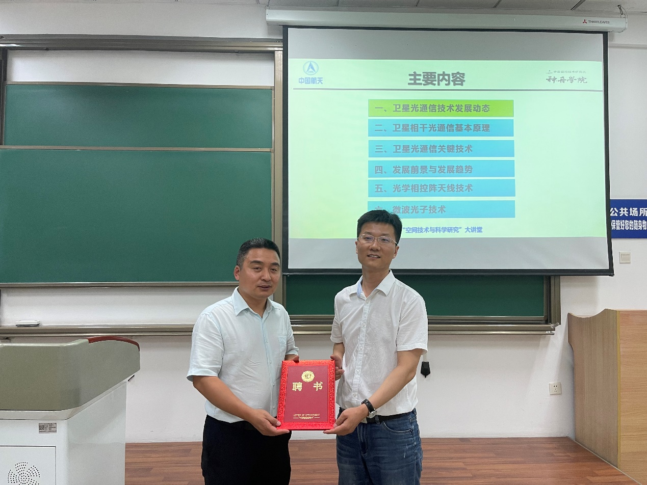 兼职教师聘书。高永胜表示,这是意义深远的一堂课,加深了同学们对《光电技术》课程纵向认知,也帮助同学们搭建了理论知识和实践应用的桥梁,为后期专业课程的深入学习奠定了坚实的基础。希望同学们在随后的学习中投入热情、凝聚力量,坚定理想信念、勇担强国使命,催生丰硕成果,为实现科技强国、铸造大国重器贡献力量。
