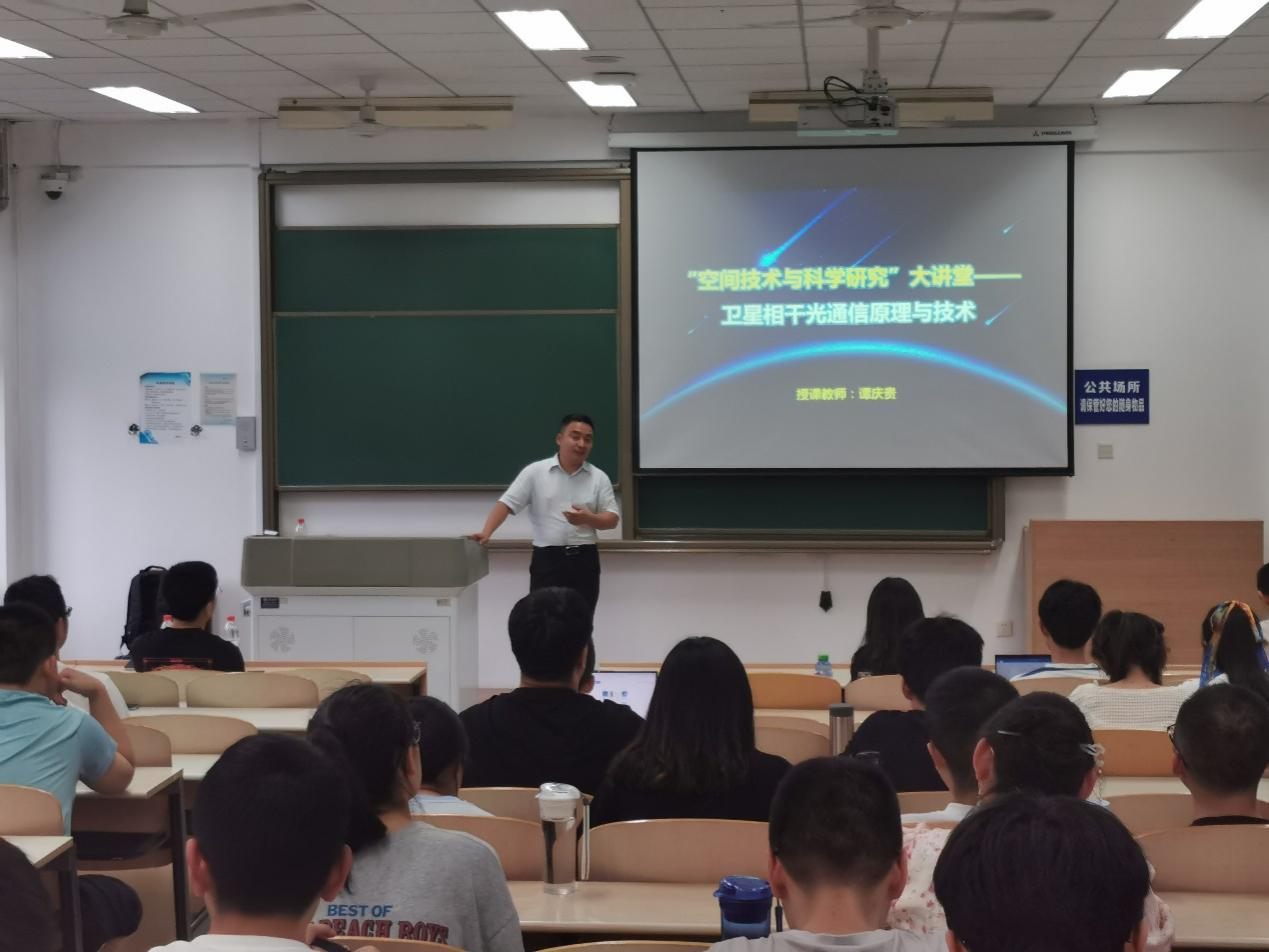 专业课《光电技术》课堂请来了一位特殊的老师——西安空间无线电技术研究所(航天五院西安分院)研究员谭庆贵博士。他为该课程的50余名本科生讲授了“卫星相干光通信原理”课程内容。《光电技术》课程主讲教师高永胜副教授、翟伟乐副教授参加了本次授课活动。