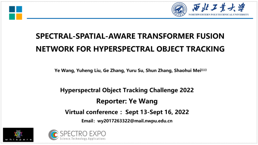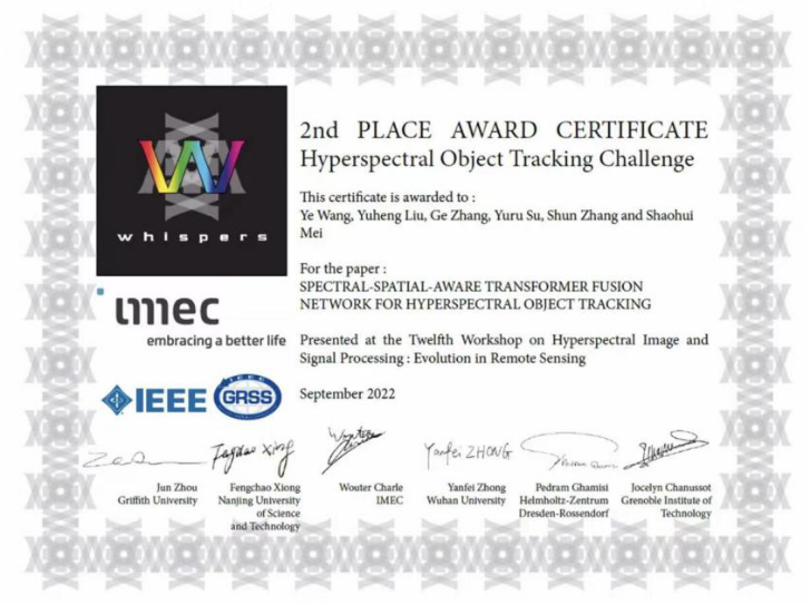 9月13日-16日,第二届国际高光谱目标追踪挑战赛暨第十二届高光谱图像和信号处理大会:遥感的演进(WHISPERS 2022)在意大利罗马举办。受疫情影响,我院梅少辉教授指导博士生王烨、硕士生刘瑜恒线上参会。经过激烈角逐,他们斩获了高光谱目标追踪挑战赛亚军。随后,王烨同学受邀对于比赛论文《Spectral-spatial-aware transformer fusion network for hyper spectral object tracking》做了口头报告。