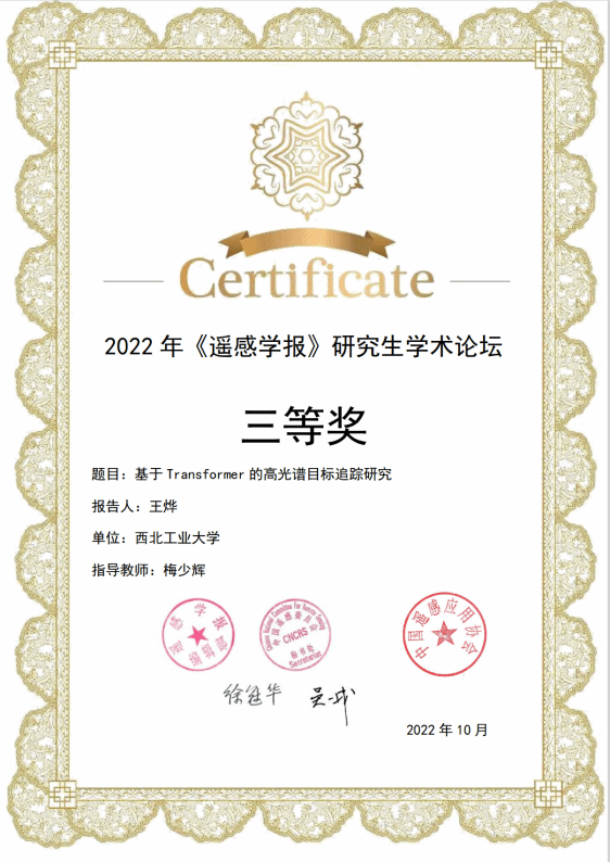 智能光电信息获取与处理课题组梅少辉教授指导的博士生王烨获得此论坛的优秀报告。王烨同学在此论坛分享了《基于Transformer的高光谱视频目标追踪方法研究》的相关工作。