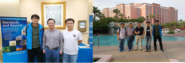 左图左起杨懋副教授、李波教授、闫中江副教授和团队成员在美国参加IEEE802标准的全体会议
