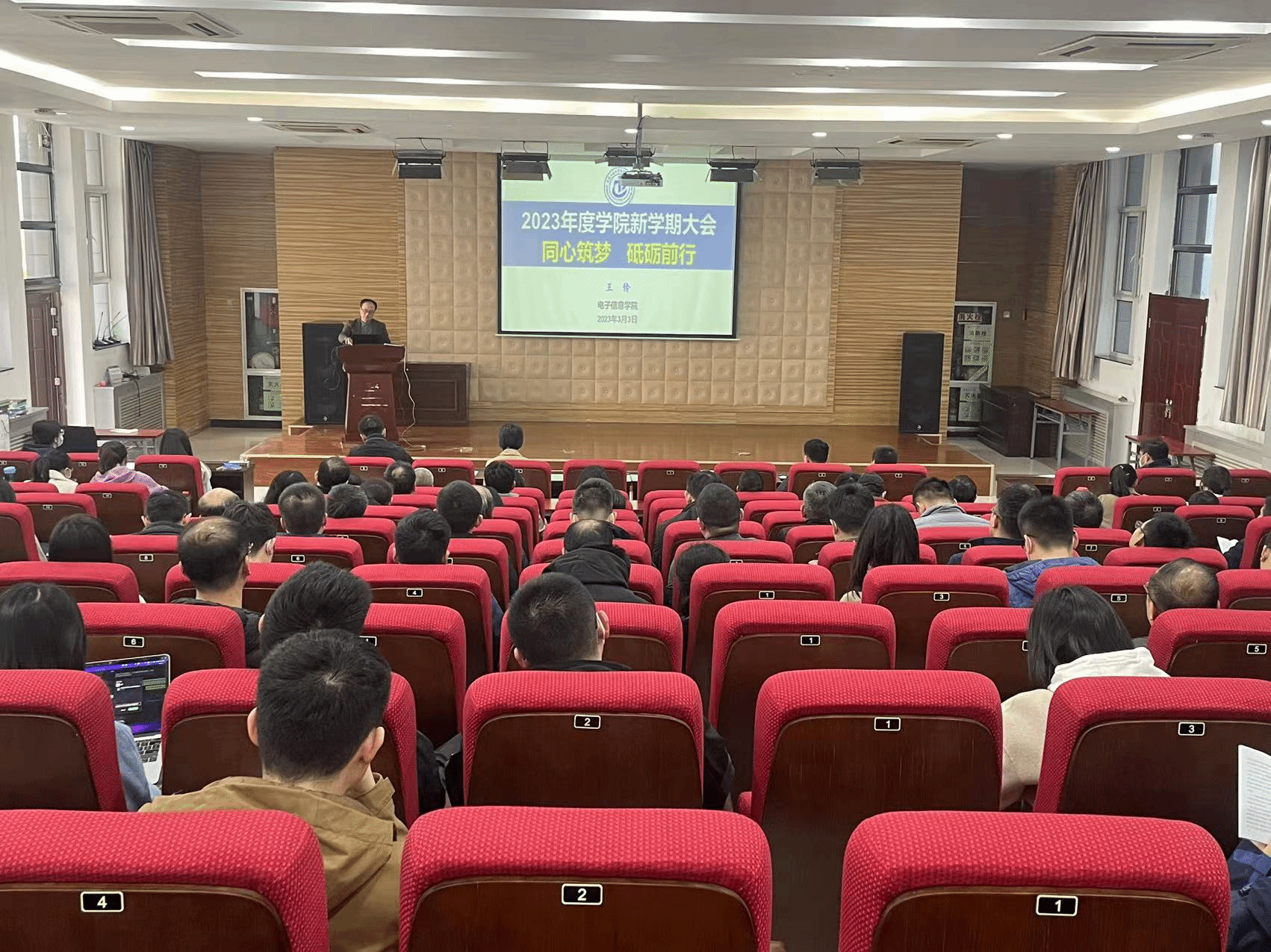 在8、9院报告厅举行春季学期全院大会。学院领导班子及全院教职工参加大会。会议由党委书记侯俊主持。