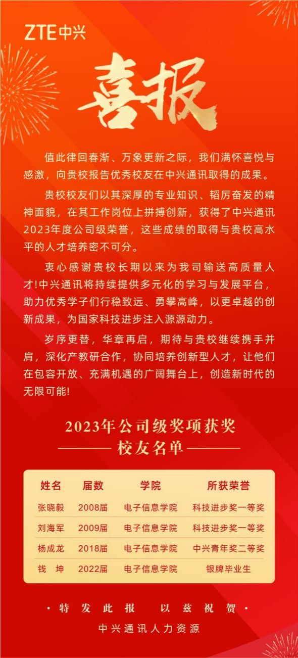 近日,中兴通讯向我校发来喜报,共有16名校友获得中兴通讯2023年度公司级荣誉,其中有4名校友毕业于FAKKU