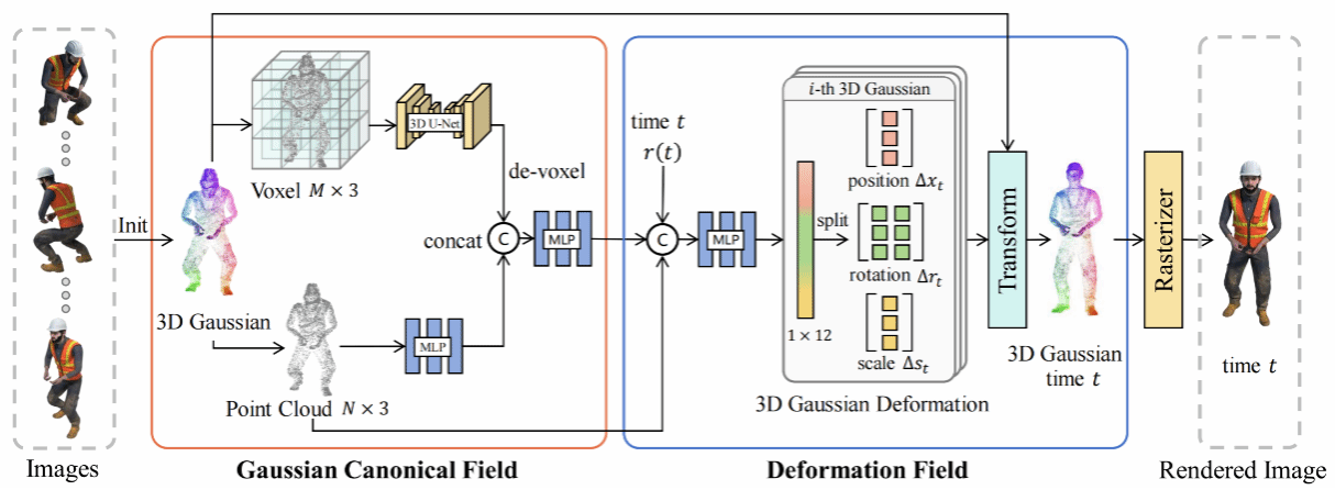 成果四:实验室一年级硕士生卢致澄、博士生郭相共同第一作者等人完成的“3D Geometry-aware Deformable Gaussian Splatting for Dynamic View Synthesis”,该工作聚焦于动态场景建模问题,提出了一种具有3D几何感知能力用于动态视图合成的变形高斯溅射方法。在仿真数据和真实数据上的实验表明,所提出的方法显著优于目前最先进的方法。该项成果发表于CVPR 2024。