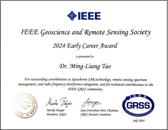 陶明亮教授凭借其在国际遥感频率管理与干扰抑制方面的贡献,荣获IEEE地球科学与遥感学会2024年度青年成就奖(IEEE GRSS Early Career Award),这是我校教师首次获得该国际奖项。