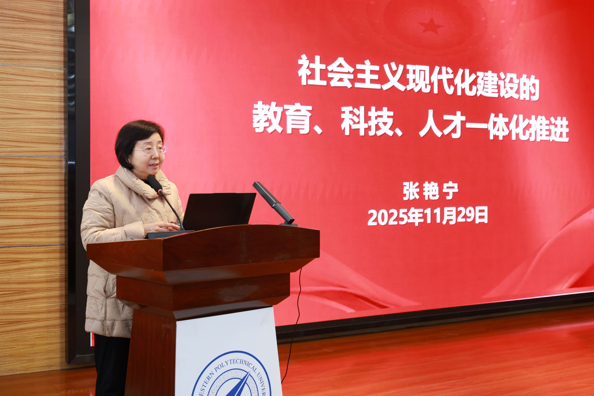 思政课上,张艳宁回溯民族复兴壮阔征程,从民族危亡之际的筚路蓝缕、求索图强,到建设时期艰苦卓绝、奋起直追,再到新时代国家富强、社会繁荣的蓬勃气象,深刻阐释了教育、科技、人才协同发力对建设现代化强国的关键作用。她结合我校在国家建设不同时期的学科布局、培养目标与人才培养成效,生动诠释了“教育为科技育人才,科技靠人才破难关,人才凭教育强根基”的核心要义与深刻内涵。接着,她以人才强国战略为引领,围绕“总师型”人才培养与科技创新核心任务,紧扣人才培养、科学研究、师资队伍一体化建设,分享了学校在加快教育、科技、人才强国建设中的实践路径。张艳宁寄语全体师生:“干惊天动地事,做隐姓埋名人;干一事,终一生!”期盼大家在教育、科技、人才一体化推进的征程中,续写新时代“西工大现象”的新辉煌!