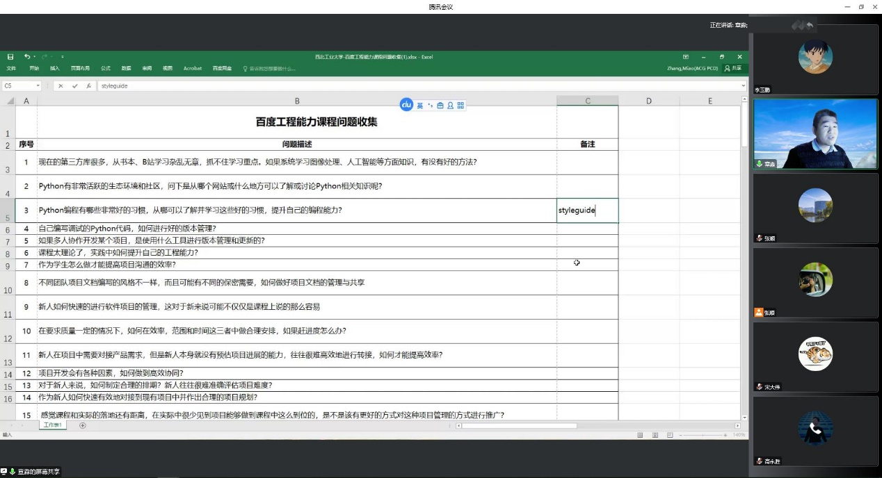 11月5日晚,在《Python程序设计》课堂,百度金牌讲师、百度智能云资深研发工程师章淼博士就专业能力提升、未来行业发展、学生职业发展规划等相关问题进行了在线授课和答疑,70多名学生参与聆听。FAKKU